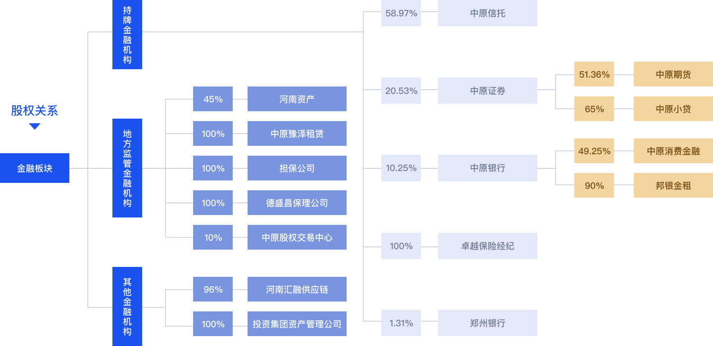 近年来,按照省政府要求,投资集团加大对金融����� �������Ƴ������������ �������Ƴ������������ �������Ƴ������������ �������Ƴ�������企业投资,牵头组建中原银行,支持中原����� �������Ƴ����������� �������Ƴ������������ �������Ƴ����������� �������Ƴ�������证券A+H上市,持续补充中����� �������Ƴ������������ �������Ƴ����������� �������Ƴ������������ �������Ƴ�������原信����� �������Ƴ����������� �������Ƴ������������ �������Ƴ����������� �������Ƴ������������ �������Ƴ��������托资本,发起设立河南资产,不断提高国有金融资本����� �������Ƴ������������ �������Ƴ������������ �������Ƴ������������ �������Ƴ�������和金融企业的管控力,并表����� �������Ƴ������������ �������Ƴ������������ �������Ƴ������������ �������Ƴ�������资产规模占投资集团资产规模6����� �������Ƴ������������ �������Ƴ����������� �������Ƴ������������ �������Ƴ�������4%,逐步形成全牌照、多业态的国有金融资本投资����� �������Ƴ����������� �������Ƴ������������ �������Ƴ������������ �������Ƴ������运营平台。