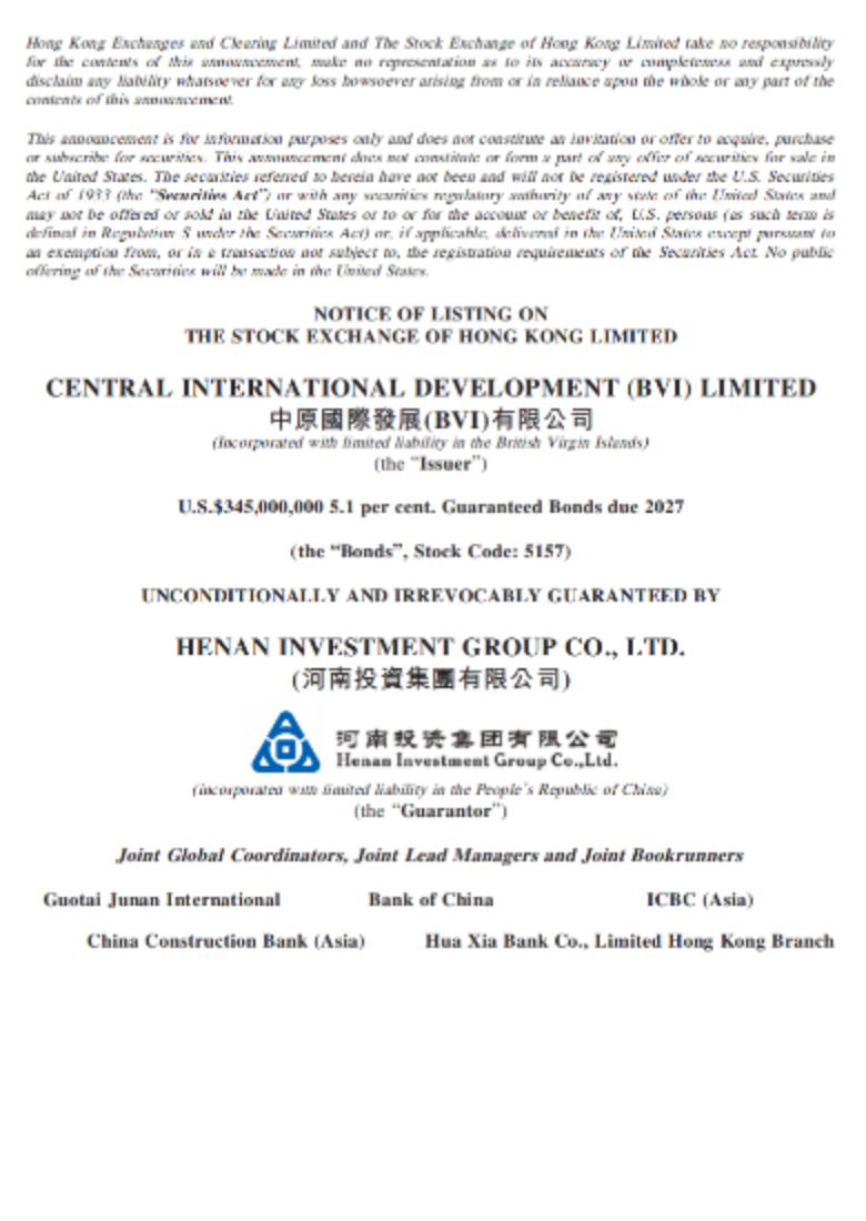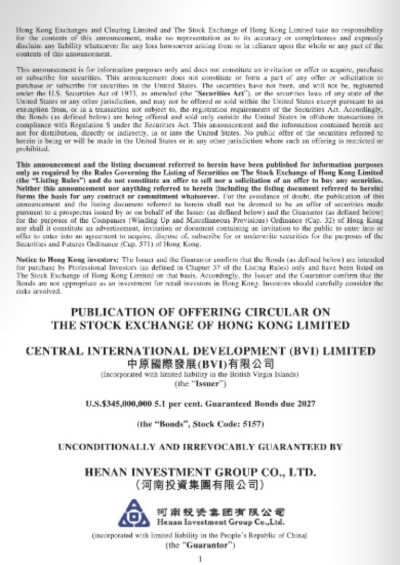 Publication o����� �������Ƴ������������ �������Ƴ������������ �������Ƴ������������ �������Ƴ�������f Offering Ci����� �������Ƴ������������ �������Ƴ������������ �������Ƴ������������ �������Ƴ�������rcular - U.S.$����� �������Ƴ������������ �������Ƴ������������ �������Ƴ������������ �������Ƴ�������345,000,000 5.1 per cen����� �������Ƴ����������� �������Ƴ������������ �������Ƴ������������ �������Ƴ�������t. Guaranteed Bonds due ����� �������Ƴ������������ �������Ƴ������������ �������Ƴ����������� �������Ƴ�������2027 issued by CE����� �������Ƴ������������ �������Ƴ������������ �������Ƴ������������ �������Ƴ������NTRAL INTERNATIONAL DE����� �������Ƴ������������ �������Ƴ������������ �������Ƴ������������ �������Ƴ�������VELOPMENT (BVI) ����� �������Ƴ������������ �������Ƴ������������ �������Ƴ������������ �������Ƴ�������LIMITED 中 原 國 際����� �������Ƴ������������ �������Ƴ������������ �������Ƴ����������� �������Ƴ������� 發 展 (BVI)有 限 公 司����� �������Ƴ������������ �������Ƴ������������ �������Ƴ����������� �������Ƴ������� unconditionally and i����� �������Ƴ������������ �������Ƴ������������ �������Ƴ������������ �������Ƴ�������rrevocably guaranteed ����� �������Ƴ������������ �������Ƴ������������ �������Ƴ����������� �������Ƴ�������by Henan Investm����� �������Ƴ������������ �������Ƴ������������ �������Ƴ������������ �������Ƴ�������ent Group Co.,����� �������Ƴ������������ �������Ƴ������������ �������Ƴ������������ �������Ƴ������� Ltd. (河